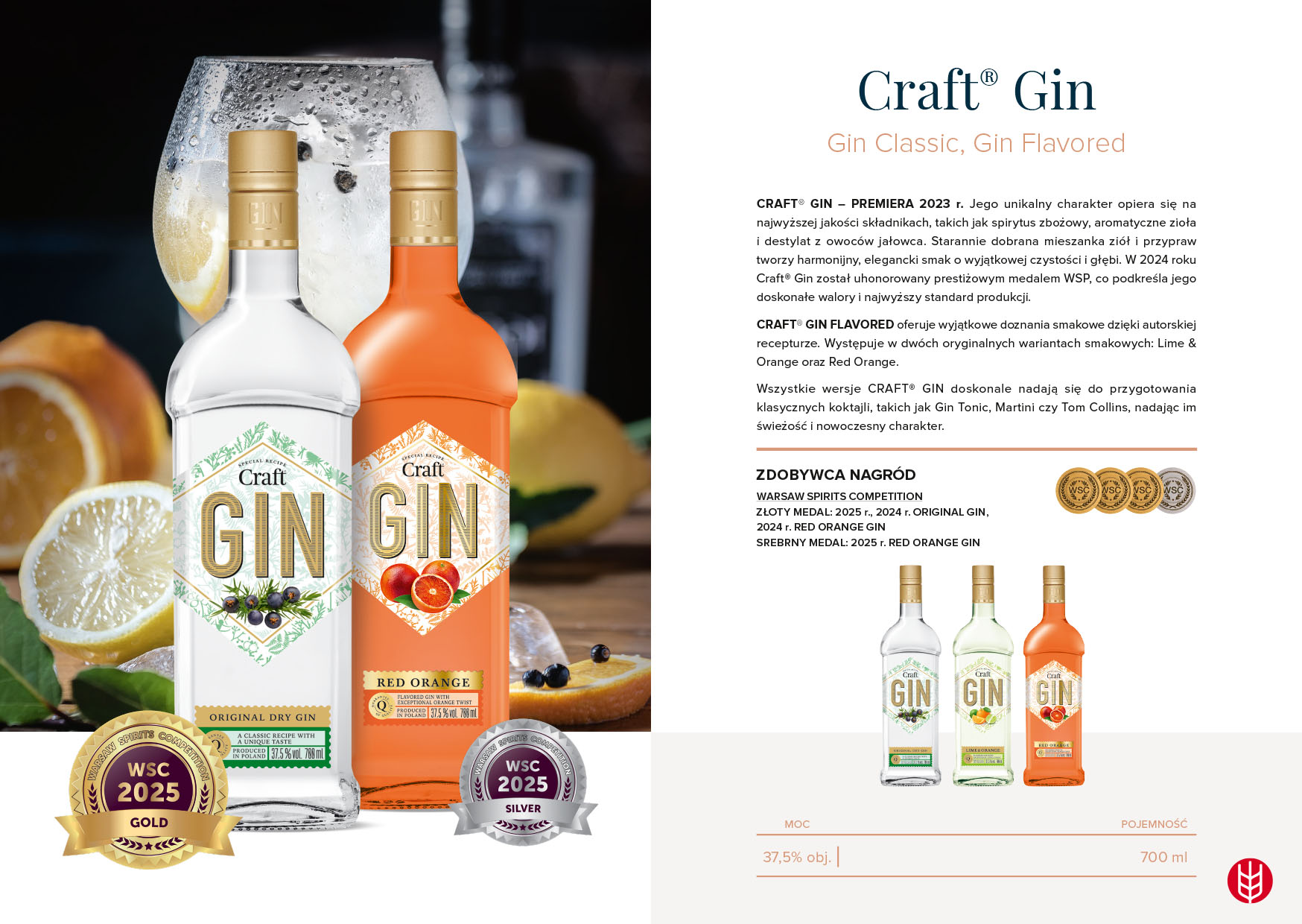 W 2024 roku Craft® Gin został uhonorowany prestiżowym medalem WSP, co podkreśla jego doskonałe walory i najwyższy