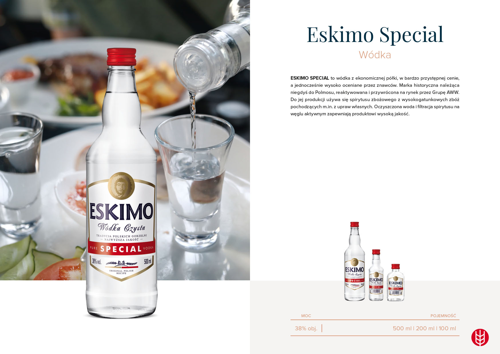 Eskimo Special to wódka z ekonomicznej półki, w bardzo przystępnej cenie, a jednocześnie wysoko oceniane przez znawców. Marka historyczna należąca niegdyś do Polmosu, reaktywowana i przywrócona na rynek przez Grupę AWW.
