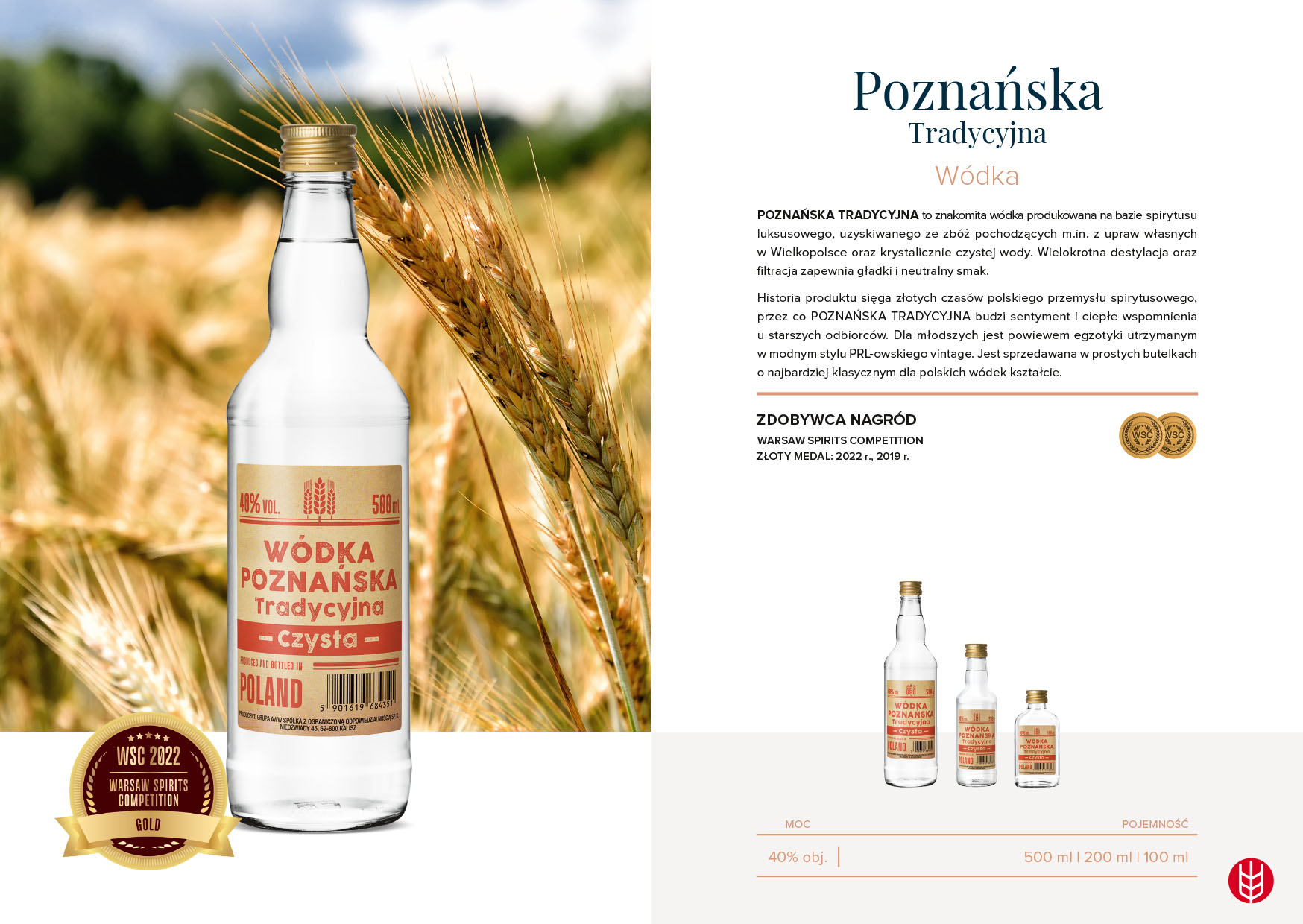 Poznańska Tradycyjna to znakomita wódka produkowana na bazie spirytusu luksusowego, uzyskiwanego ze zbóż pochodzących m.in. z upraw własnych w Wielkopolsce oraz krystalicznie czystej wody. Wielokrotna destylacja oraz filtracja zapewnia gładki i neutralny smak.